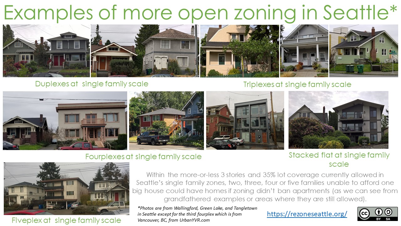 Under Seattle’s current single family zoning rules, anyone can build up to a 5,250 square foot, 3 story home (a summary of the rules is on the city website here and an infographic on what that looks like on a 5,000 square foot lot is here). A straightforward way to open up land zoned single family to more affordable options would be to keep the same lot coverage and height limits, while allowing people to divide the structure into two or more homes as they see fit. These are the conditions under which many duplexes, triplexes, and stacked flats that still sit right alongside single family homes in Seattle were built, prior to nearly 100 years of downzoning (the Sightline Institute has the history here).