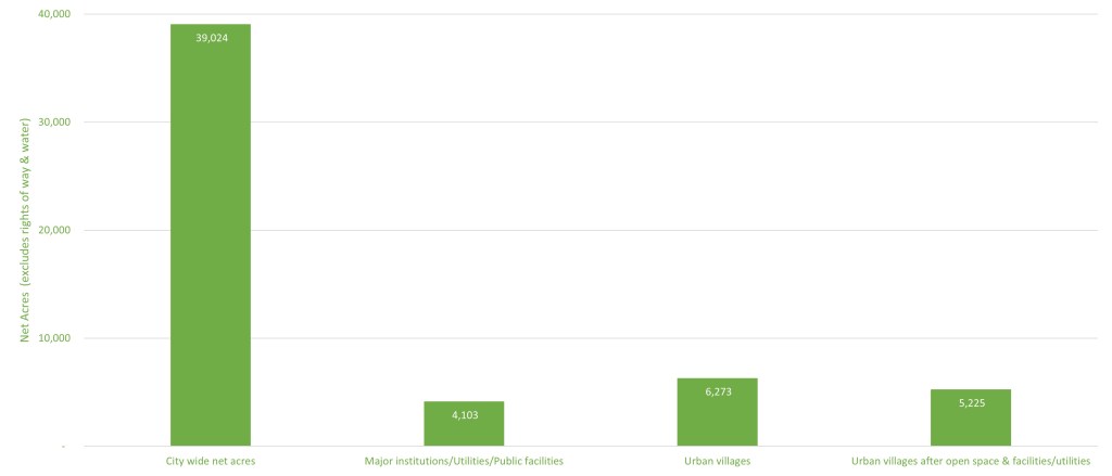 There are around 6,300 acres of land in urban villages. But since some of that land is dedicated to institutions, utilities, and public facilities, and some of it is open space, that leaves 5,225 acres available for buildings of all types (residential, commercial, mixed use, and industrial). That’s just 27 percent more land than major institutions, utilities, and public facilities citywide.