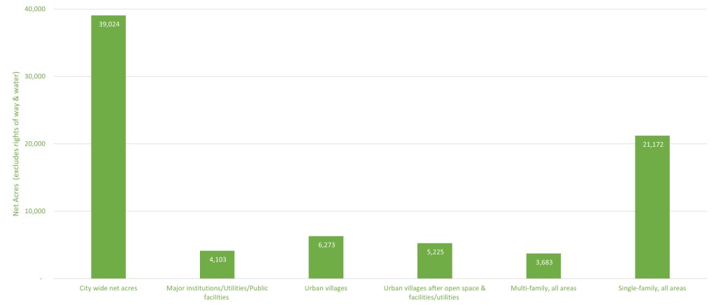 As a comparative benchmark, there are 4,103 acres citywide occupied by major institutions, utilities, and public facilities. So imagine your experience coming across public schools and City Light facilities, as you’ve moved about the city to get a sense of scale.