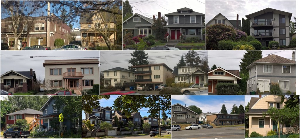 And of course, in the modern era, we know the decision is absurd. In many, many neighborhoods multifamily homes have been intermixed with single family detached houses without causing shortages of light or air. (Photos from Wallingford and Green Lake.)
